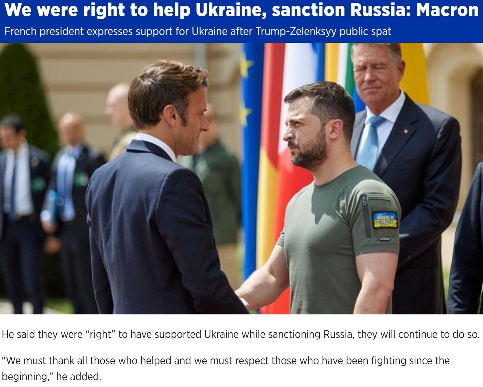 法國(guó)總統(tǒng)馬克龍?jiān)谂c澤連斯基通話(huà)后對(duì)媒體稱(chēng),西方支持烏克蘭是“正確”的,而且應(yīng)該繼續(xù)這樣做,因?yàn)椤澳切囊婚_(kāi)始就在戰(zhàn)斗的人是在為歐洲的安全而戰(zhàn)”。