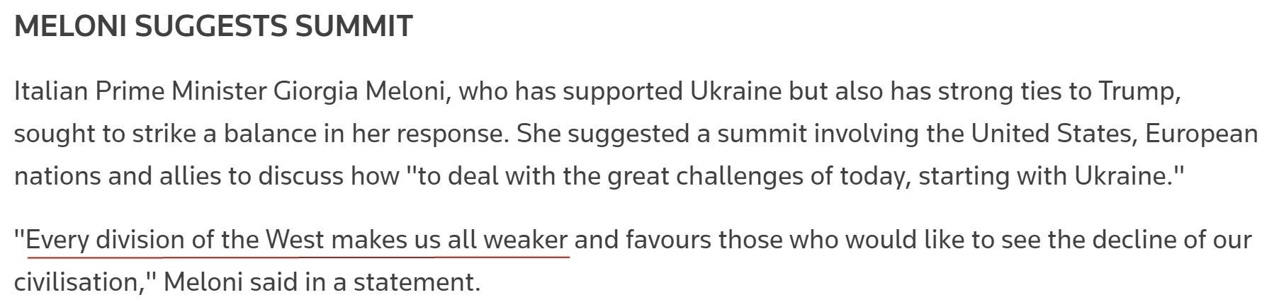 意大利總理梅洛尼日前警告說(shuō),在當(dāng)前形勢(shì)下,西方國(guó)家保持凝聚力非常重要。她呼吁召開(kāi)緊急外交峰會(huì)協(xié)調(diào)立場(chǎng)。