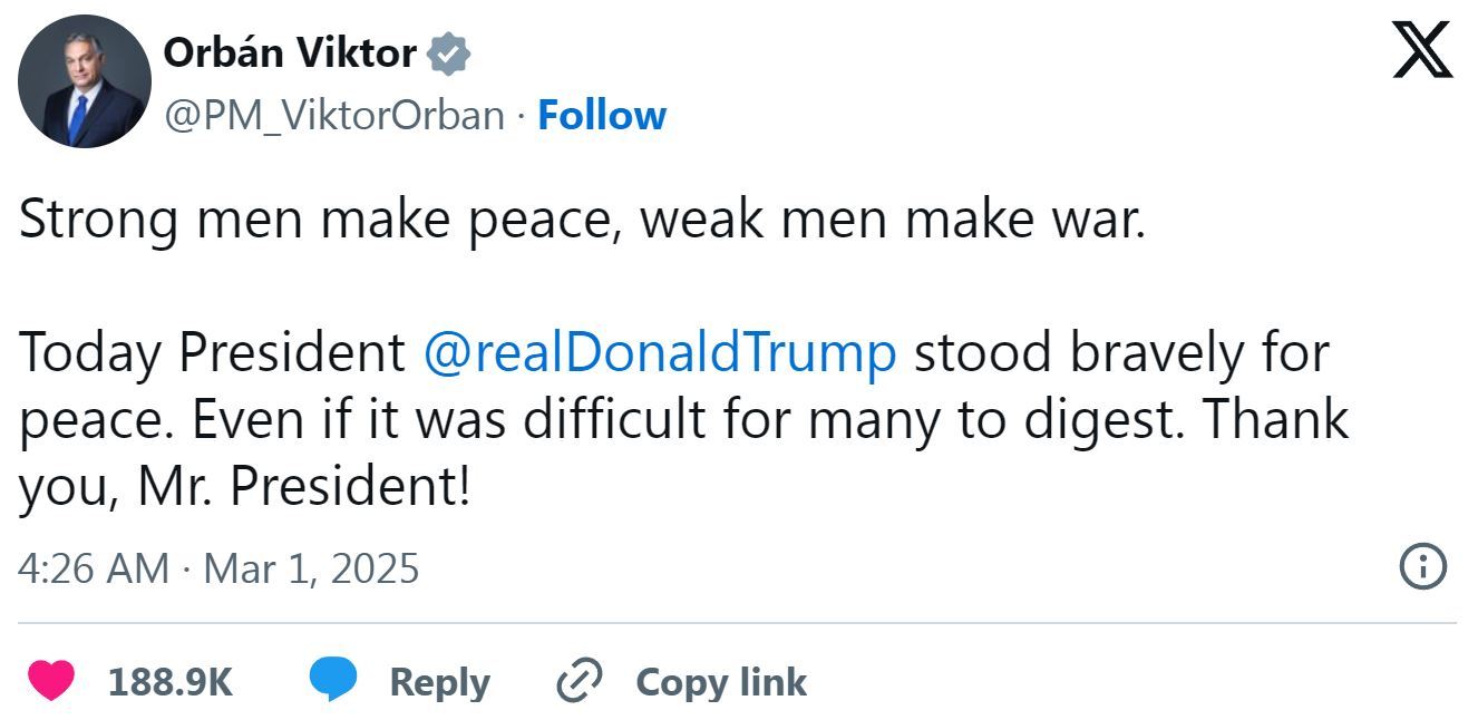 一向和歐洲“主流意見(jiàn)”唱反調(diào)的匈牙利總理歐爾班就對(duì)特朗普此次的表現(xiàn)大加贊賞。