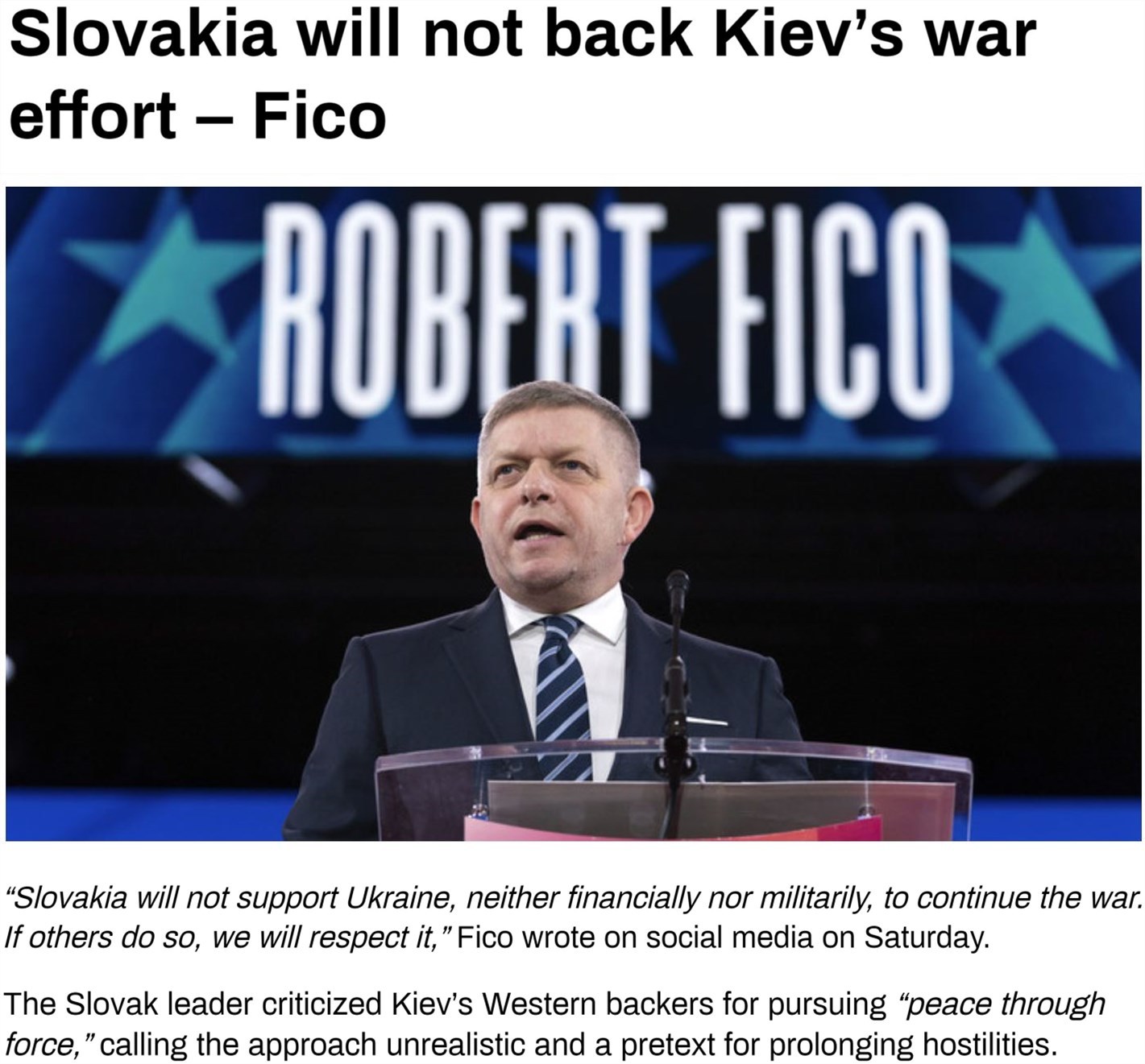 斯洛伐克總理菲佐則在社交媒體上發(fā)文,重申拒絕向?yàn)蹩颂m提供軍事和財(cái)政支持的立場(chǎng)。他還批評(píng)稱(chēng),“用實(shí)力實(shí)現(xiàn)和平”的戰(zhàn)略不切實(shí)際,只是“繼續(xù)沖突”的借口。