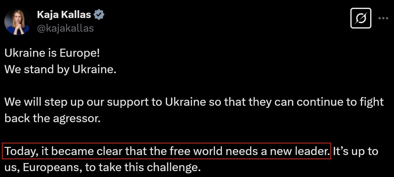 歐盟外交與安全政策高級(jí)代表卡拉斯日前表示,“世界需要一個(gè)新的領(lǐng)導(dǎo)者”。言外之意就是,西方不能只靠美國(guó)。