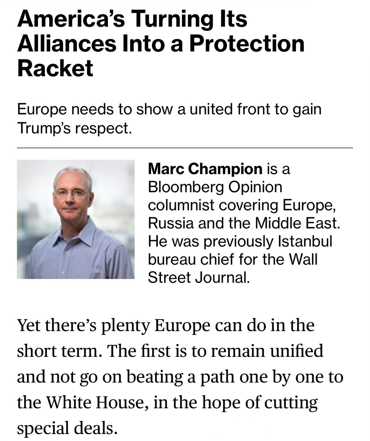 在彭博社專(zhuān)欄作家馬克·錢(qián)皮恩看來(lái),特朗普政府奉行的“美國(guó)優(yōu)先”政策導(dǎo)致跨大西洋關(guān)系裂痕不斷加深。歐洲領(lǐng)導(dǎo)人應(yīng)保持團(tuán)結(jié),而不是一個(gè)接一個(gè)前往白宮,希望與美達(dá)成特殊協(xié)議。