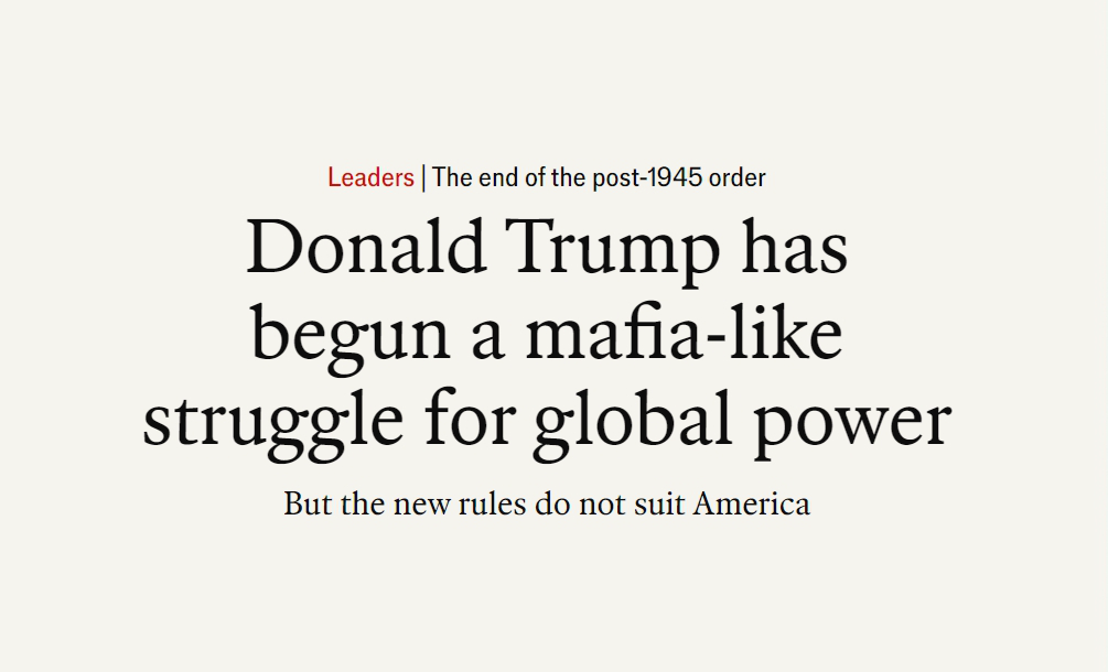 英國(guó)《經(jīng)濟(jì)學(xué)人》網(wǎng)站近期刊文稱,美國(guó)總統(tǒng)特朗普已經(jīng)開(kāi)啟一場(chǎng)黑手黨式的全球權(quán)力爭(zhēng)奪。1945年后建立的世界秩序正在加速撕裂。一個(gè)強(qiáng)權(quán)即公理、小國(guó)受欺負(fù)的世界正快速到來(lái)。文章摘要如下: