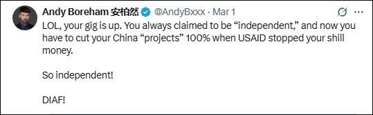 “笑死,你們?nèi)嗽O(shè)崩了?!痹谥袊詈凸ぷ鞫嗄甑男挛魈m媒體人安迪·博勒姆(中文名安柏然)也嘲諷道,“成天標(biāo)榜自己‘獨(dú)立’,現(xiàn)在美國國際開發(fā)署斷了黑錢,對華‘項(xiàng)目’得100%砍光。還真是獨(dú)立?。≮s緊涼透吧!”