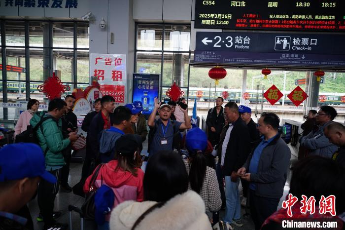 3月16日,云南省紅河州河口縣河口北站,一位導(dǎo)游組織越南旅游團候車。中新社記者 劉冉陽 攝