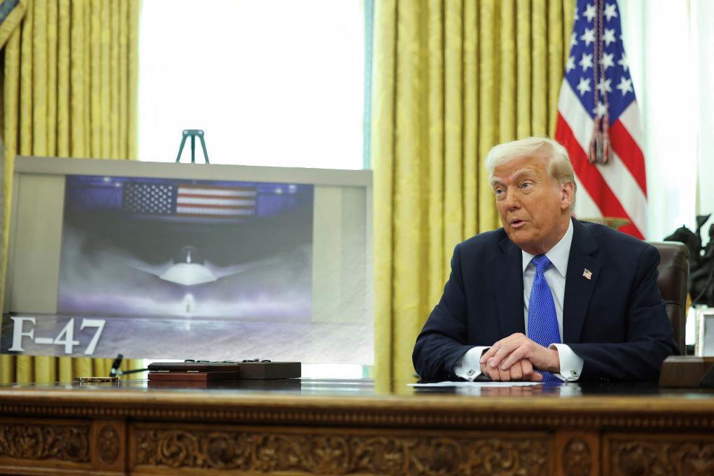 3月21日,美國(guó)總統(tǒng)特朗普在白宮一場(chǎng)活動(dòng)中發(fā)表講話(huà)并展示F-47戰(zhàn)斗機(jī)圖像。新華社/美聯(lián)