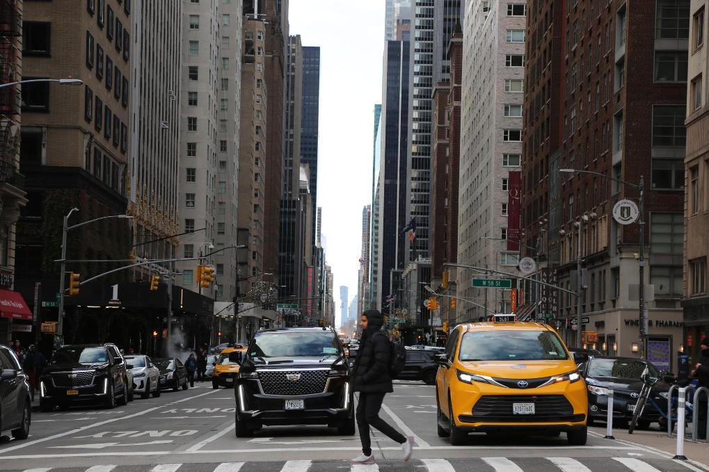 1月5日,在美國紐約曼哈頓,行人通過擁堵減緩區(qū)內(nèi)的一個(gè)人行橫道。新華社記者劉亞南攝
