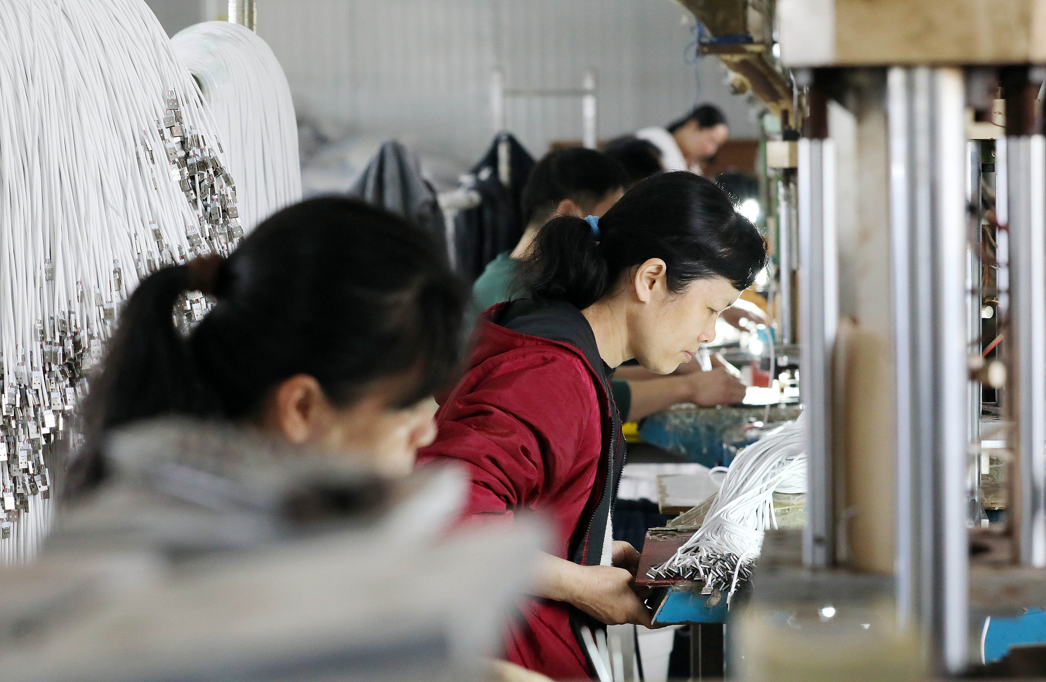 △廣西柳州一家電子廠生產車間,工人在生產線上加工數(shù)據線等電子產品。