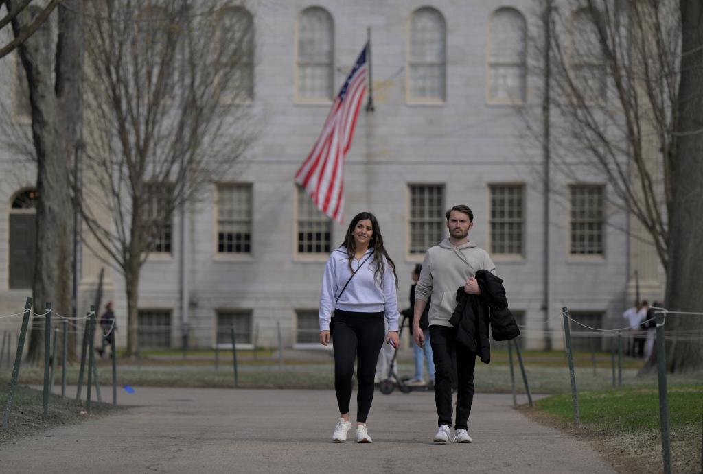 4月15日,人們漫步在美國馬薩諸塞州劍橋市的哈佛大學校園內(nèi)。新華社/路透