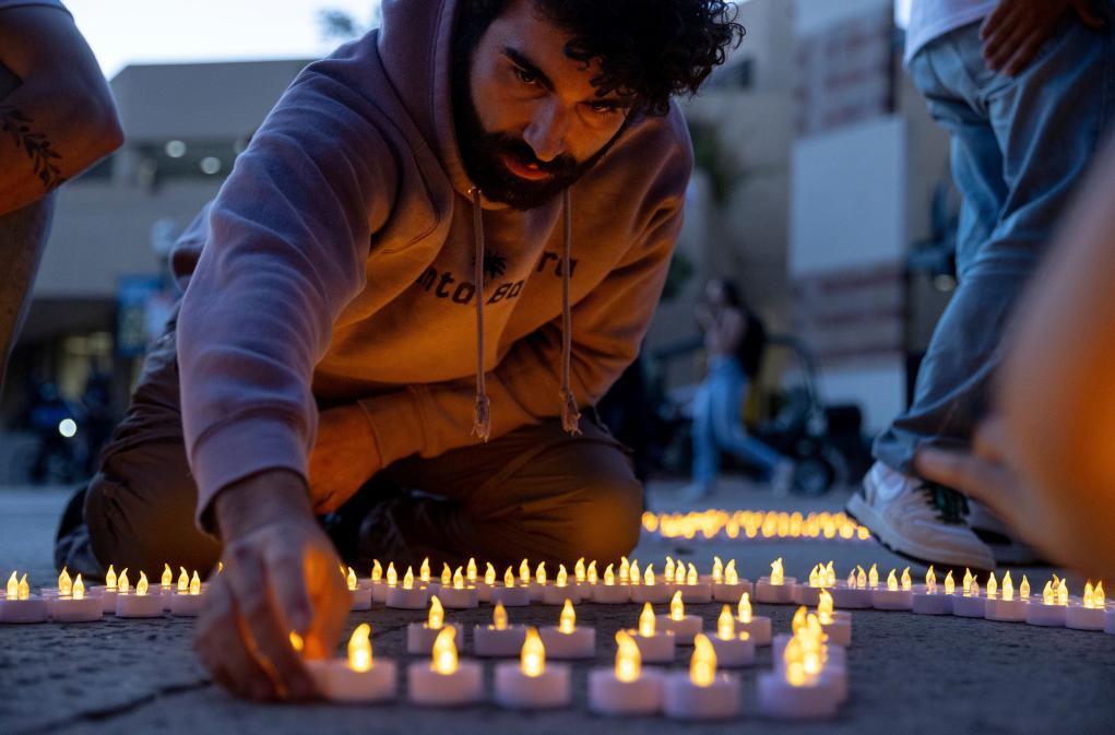 2024年10月7日,新一輪巴以沖突爆發(fā)一周年之際,在美國加利福尼亞州洛杉磯,加利福尼亞大學洛杉磯分校的學生們參加集會活動時點亮蠟燭。新華社/美聯(lián)