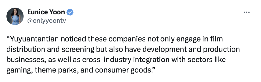 美媒的一位記者還專門在社交媒體上援引玉淵譚天的觀點說,由于美國文化產(chǎn)業(yè)的核心盈利點確實在于知識產(chǎn)權和品牌價值。因此,如果中國消費者開始在電影領域?qū)γ绹a(chǎn)品“降溫”,這種趨勢很可能會進一步外溢,影響到其他依賴美國IP和品牌溢價的行業(yè)。