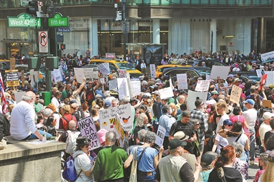 4月19日,美國多地民眾走上街頭,抗議現(xiàn)政府加征關(guān)稅、大規(guī)模裁員等政策。圖為當(dāng)天,人們在美國紐約街頭參加抗議活動。