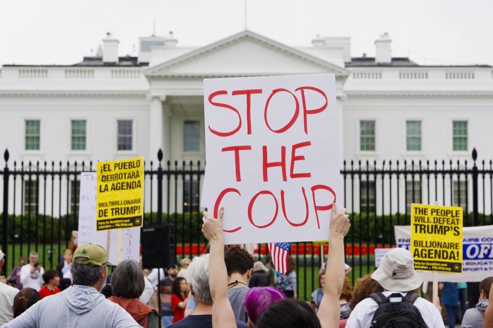 4月19日,人們?cè)诿绹锥既A盛頓白宮門前參加抗議活動(dòng)。美國多地19日舉行抗議活動(dòng),首都華盛頓、紐約、舊金山、波士頓等城市的民眾走上街頭,抗議現(xiàn)政府大規(guī)模裁員、加征關(guān)稅、驅(qū)逐移民等政策。新華社發(fā)(亞倫攝)