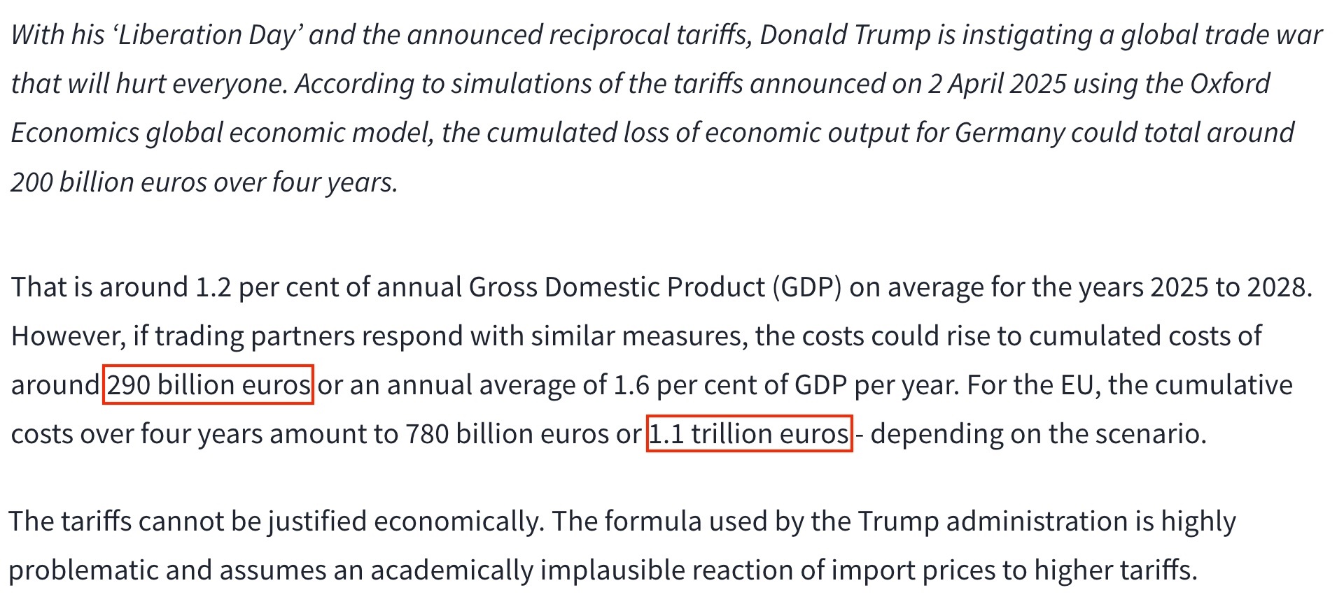德國經(jīng)濟(jì)研究所日前發(fā)布的研究報告顯示,未來四年內(nèi),美國“對等關(guān)稅”措施可能令歐盟損失1.1萬億歐元,僅德國就將損失2900億歐元。