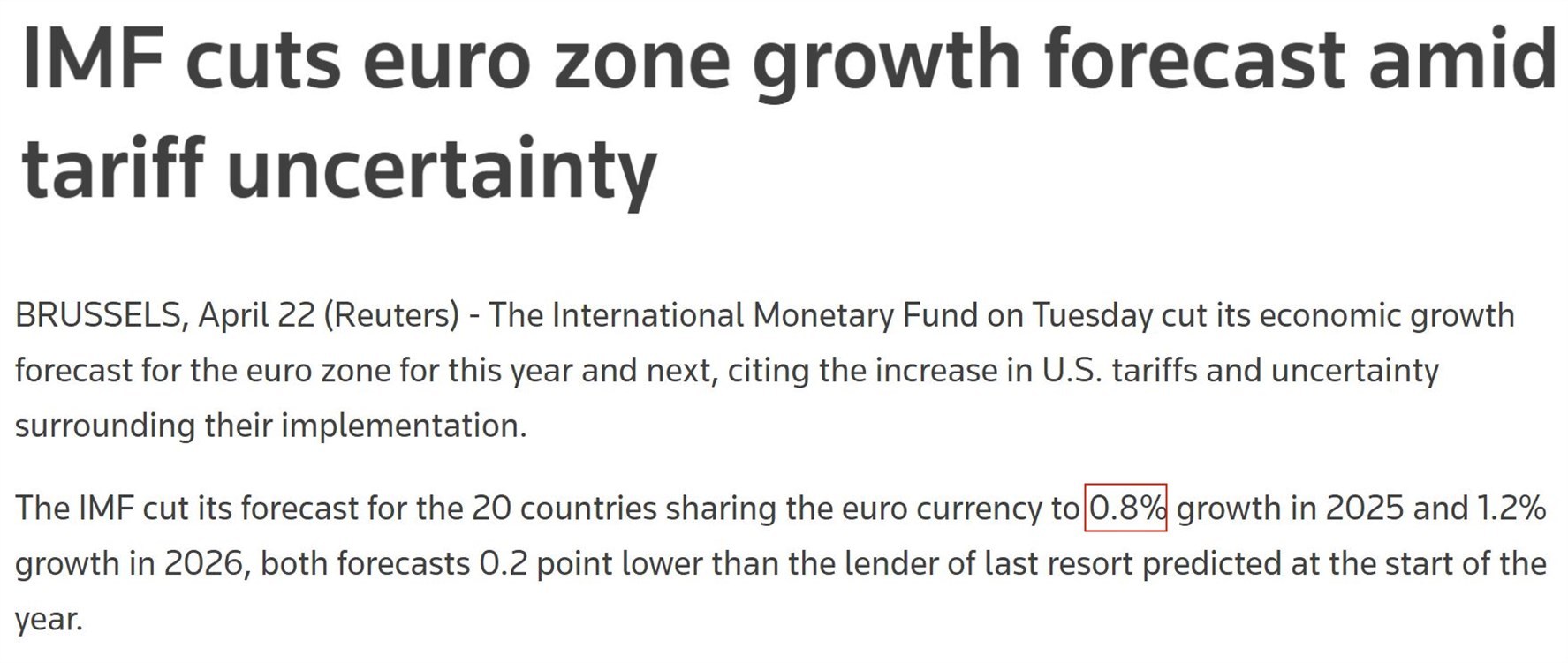 根據(jù)國際貨幣基金組織22日發(fā)布的最新一期《世界經(jīng)濟(jì)展望報告》,受美國關(guān)稅措施沖擊和政策不確定性的影響,今年歐元區(qū)經(jīng)濟(jì)增長率預(yù)計(jì)將比之前下調(diào)0.2個百分點(diǎn)至0.8%。