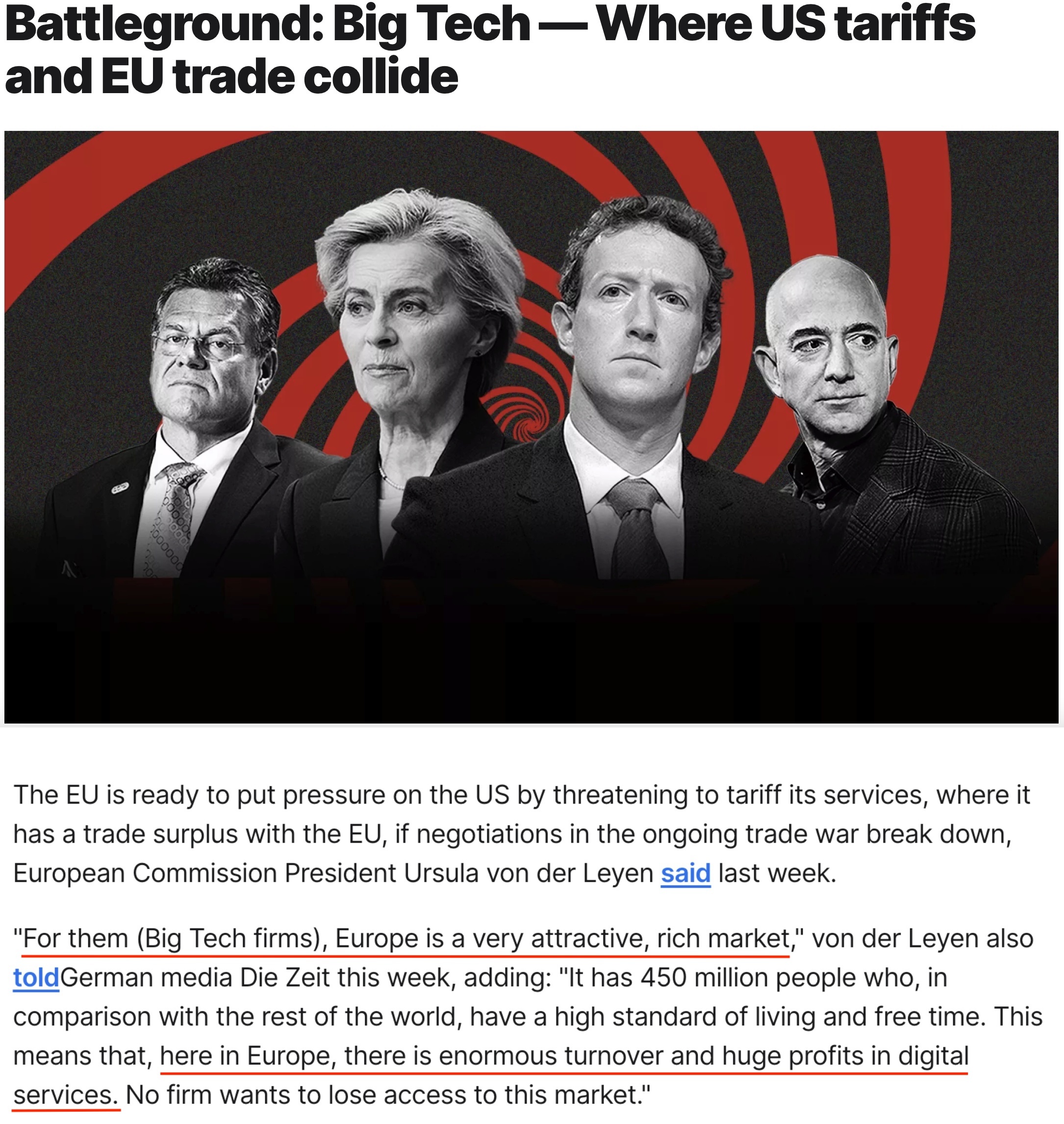 馮德萊恩強(qiáng)調(diào),歐盟有4.5億人口,民眾生活水平高,這意味著在歐盟,數(shù)字服務(wù)有著巨大的營業(yè)額和利潤,沒有誰愿意失去進(jìn)入這個市場的機(jī)會。