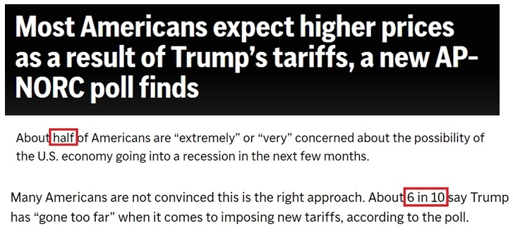 對(duì)于特朗普政府的關(guān)稅政策,近六成的受訪者認(rèn)為政府“做得太過了”。另外,約有一半受訪者“極度”或“非常”擔(dān)心美國(guó)經(jīng)濟(jì)會(huì)在未來幾個(gè)月陷入衰退。
