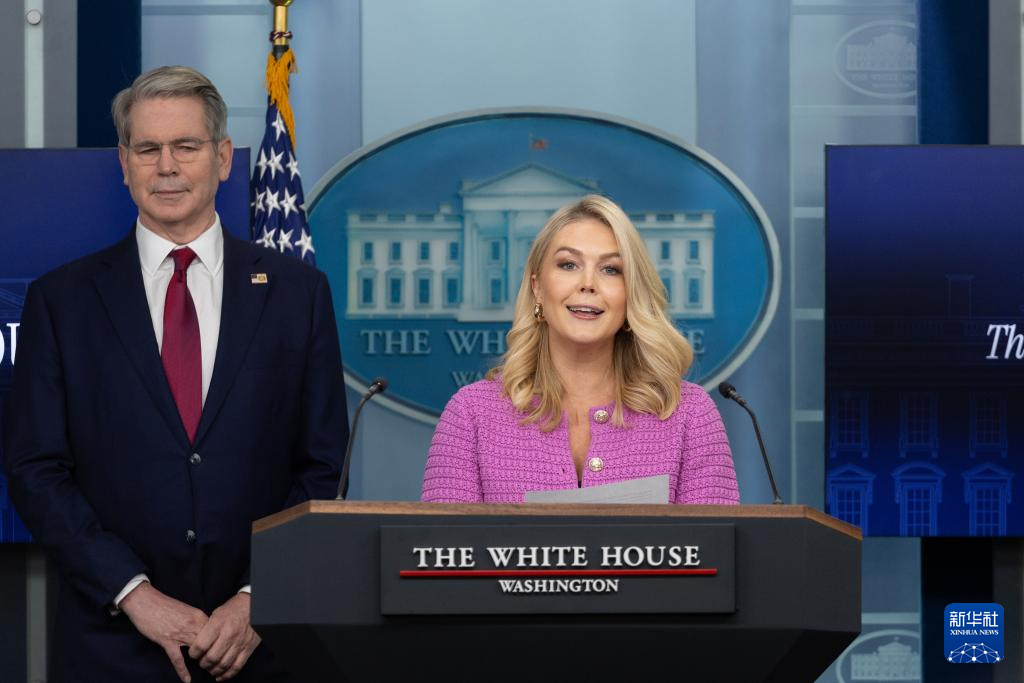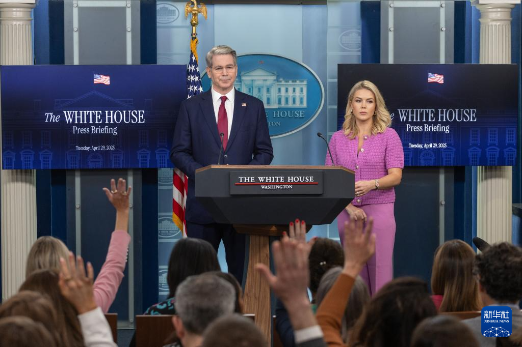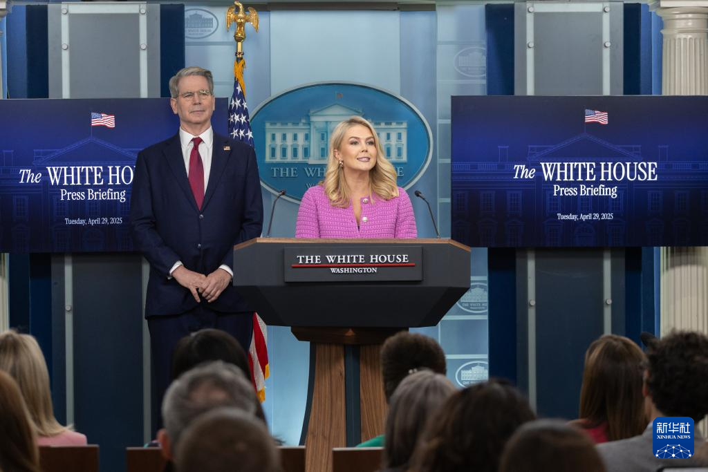 4月29日,美國白宮新聞秘書卡羅琳·萊維特(右)與美國財(cái)政部長斯科特·貝森特在華盛頓白宮出席記者會。新華社記者 胡友松 攝