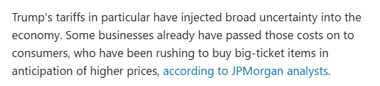 商界領(lǐng)袖們迫切希望美國的政策能有幾周的穩(wěn)定,美國農(nóng)戶們發(fā)現(xiàn)自己的聯(lián)邦食品補貼合同已經(jīng)終止,全美各地的非營利組織都在裁員,因為白宮正在削減開支。尤其是特朗普政府的關(guān)稅政策給經(jīng)濟帶來了廣泛的不確定性。摩根大通分析師表示,一些企業(yè)已經(jīng)將這些成本轉(zhuǎn)嫁給了消費者,消費者因預(yù)期價格上漲而搶購大件商品。