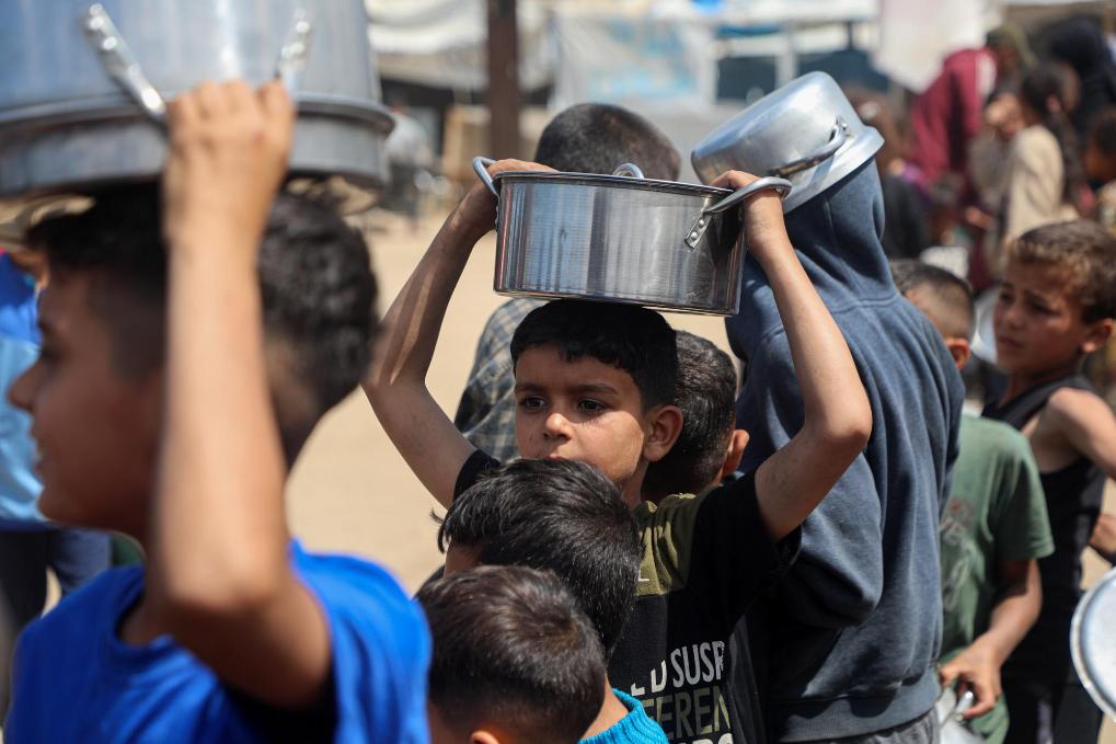 5月2日,孩子們?cè)诩由吵堑却I(lǐng)取救助食物。新華社發(fā)(里澤克·阿卜杜勒賈瓦德攝)