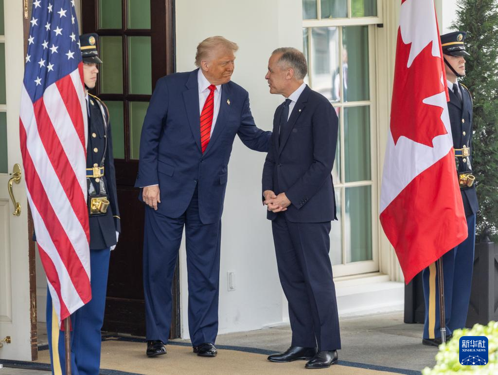 5月6日,美國總統(tǒng)特朗普(中)在華盛頓白宮迎接到訪的加拿大總理卡尼。新華社記者 胡友松 攝