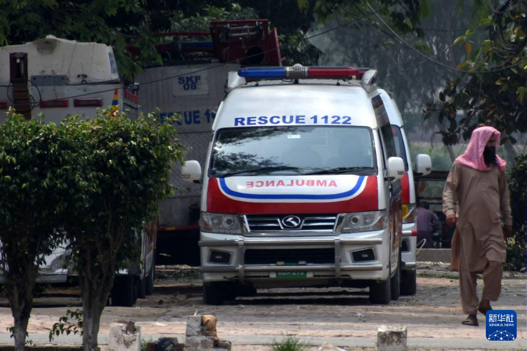 5月7日,救護車停在巴基斯坦東部旁遮普省謝赫布拉地區(qū)穆里德蓋鎮(zhèn)遭印度導彈破壞的建筑附近。新華社發(fā)(薩賈德攝)