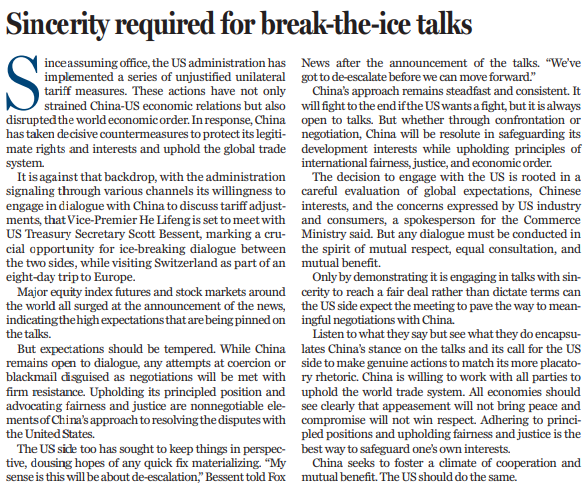 近期,美方不斷表示,希望同中方就關稅調整進行談判。當?shù)貢r間10日上午,中美經(jīng)貿(mào)高層會談在瑞士日內(nèi)瓦開始舉行。中共中央政治局委員、國務院副總理何立峰作為中美經(jīng)貿(mào)中方牽頭人,當天與美方牽頭人、美國財長貝森特舉行會談。中美關稅戰(zhàn)迎來破冰契機。