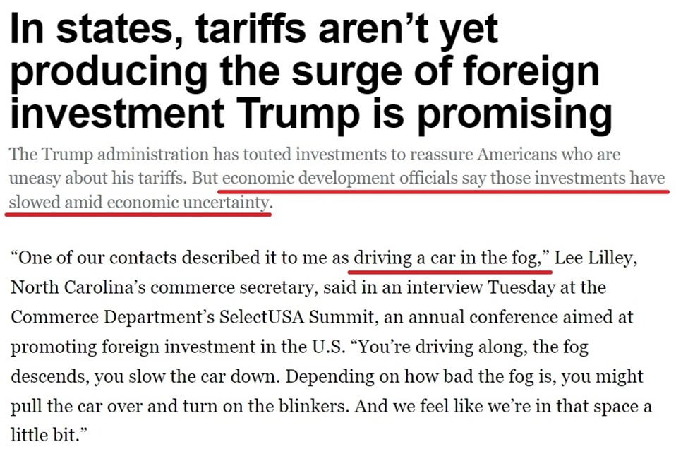 美國(guó)政府一直宣稱,加征關(guān)稅將為美國(guó)吸引數(shù)萬(wàn)億美元的外國(guó)投資。但據(jù)美國(guó)《政治報(bào)》報(bào)道,來(lái)自美國(guó)多個(gè)州的政府官員和議員都抱怨說(shuō),白宮關(guān)稅政策引發(fā)的不確定性正在阻礙外資進(jìn)入美國(guó)市場(chǎng)。
