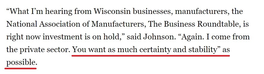 “我從本州的企業(yè)、制造商以及全美制造商協(xié)會(huì)和商業(yè)圓桌會(huì)議那里聽(tīng)到的消息是,許多外商原定的投資計(jì)劃已經(jīng)被擱置。我本人來(lái)自私營(yíng)企業(yè),我知道企業(yè)最需要的就是盡可能多的確定性和穩(wěn)定性?!?/p>