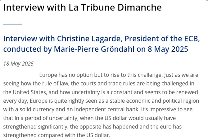 歐洲央行行長(zhǎng)拉加德日前接受采訪時(shí)也表示,近期歐元對(duì)美元走強(qiáng)看似有悖直覺(jué),其實(shí)源于金融市場(chǎng)對(duì)美國(guó)失去了信心。這是美國(guó)反復(fù)無(wú)常的關(guān)稅等政策造成的,“對(duì)歐洲來(lái)說(shuō)是一個(gè)機(jī)遇”。