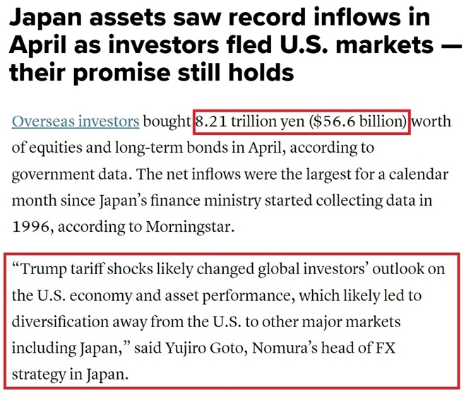 值得注意的是,在日本對(duì)美投資可能被“嚇退”的同時(shí),“逃離”美國(guó)的資金正大量涌向日本。