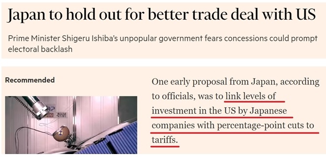 另?yè)?jù)報(bào)道,考慮到日本是美國(guó)最大海外投資來(lái)源國(guó),日方除考慮進(jìn)一步對(duì)美開(kāi)放市場(chǎng)等讓步條件外,早期談判方案中還包括將美國(guó)對(duì)日商品關(guān)稅減免的百分點(diǎn)與日本企業(yè)在美投資水平掛鉤。
