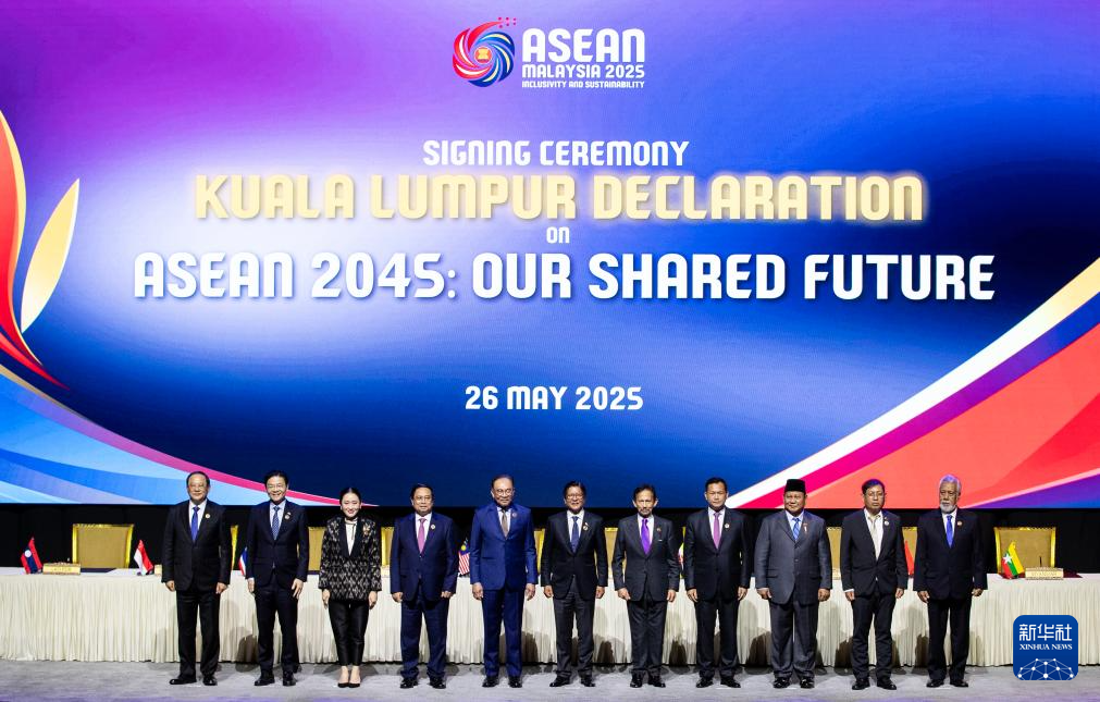 5月26日,在馬來(lái)西亞首都吉隆坡,老撾總理宋賽、新加坡總理黃循財(cái)、泰國(guó)總理佩通坦、越南總理范明政、馬來(lái)西亞總理安瓦爾、菲律賓總統(tǒng)馬科斯、文萊蘇丹哈桑納爾、柬埔寨首相洪瑪奈、印度尼西亞總統(tǒng)普拉博沃、緬甸外交部常秘昂覺(jué)莫(前排從左至右)出席第46屆東盟峰會(huì)“吉隆坡宣言”簽署儀式。新華社記者 馬平 攝