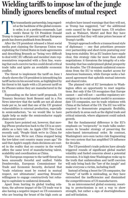 原標題:Wielding tariffs to impose law of the jungle blindly ignores benefits of mutual respect