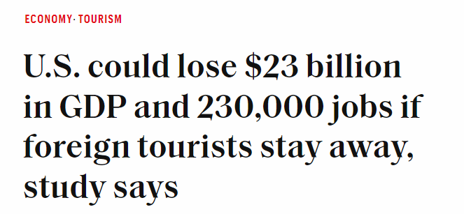 經(jīng)濟(jì)分析公司Implan首席經(jīng)濟(jì)學(xué)家珍妮弗·索瓦爾德森(Jennifer Thorvaldson)測算稱,基于3月份外國游客赴美人數(shù)下降的情況,若今年國際游客減少10%,不僅美國國內(nèi)生產(chǎn)總值(GDP)將損失230億美元,還會損失大約23萬個工作崗位。