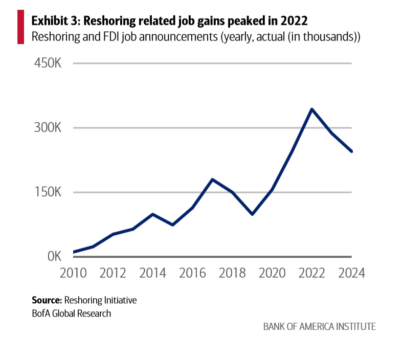 報(bào)告顯示,美國制造業(yè)回流創(chuàng)造的就業(yè)機(jī)會在2022年達(dá)到高峰后開始減少。