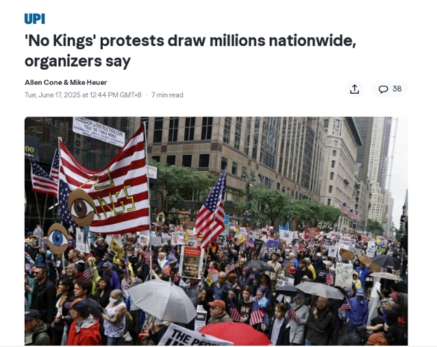 據美國合眾國際社(UPI)6月17日報道,上個周末,全美多地爆發(fā)約2000場名為“不要國王”(No Kings)的抗議活動,組織者稱參與人數達數百萬。