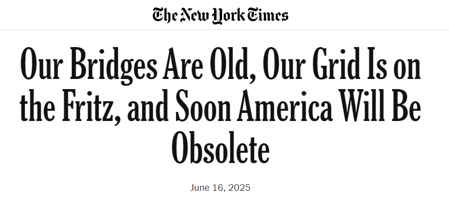 《紐約時報》6月16日刊發(fā)專欄文章稱,美國的橋梁、電網和港口等基礎設施正面臨嚴重的老化與不足,美國即將被“老化淘汰”。