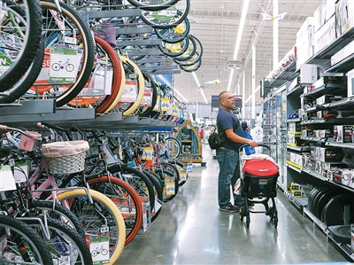 消費(fèi)者在美國加利福尼亞州洛杉磯縣一家沃爾瑪商店內(nèi)采購商品。
