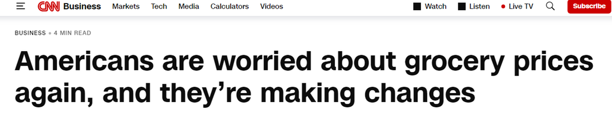 報(bào)道還指出,民調(diào)清晰地表明美國(guó)人對(duì)高昂的食品成本和經(jīng)濟(jì)狀況倍感焦慮,他們的購(gòu)物方式也因此出現(xiàn)巨大改變。這與眾多企業(yè)提到的情況一致,他們表示消費(fèi)者正在調(diào)整購(gòu)物模式,比如從購(gòu)買(mǎi)大包裝改成買(mǎi)小包裝,只買(mǎi)生活必需品,更多地在家吃飯。