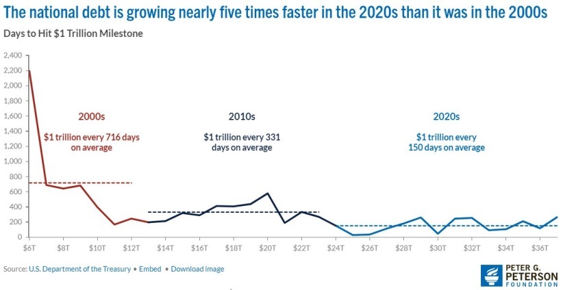 據(jù)其統(tǒng)計(jì),在本世紀(jì)第一個(gè)十年,美債每增加1萬(wàn)億美元平均需要近兩年(716天);在本世紀(jì)第二個(gè)十年,這一時(shí)間縮短到了不到一年(331天);而到了目前所處的本世紀(jì)第三個(gè)十年,美債平均不到半年(150天)就會(huì)跨越一個(gè)萬(wàn)億美元級(jí)大關(guān)。