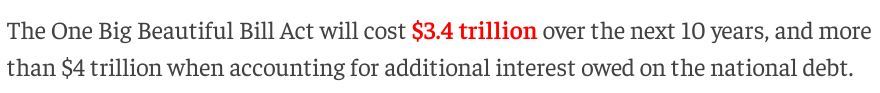根據(jù)美國(guó)國(guó)會(huì)預(yù)算辦公室(CBO)上月做出的評(píng)估,“大而美”法案預(yù)計(jì)將在未來(lái)十年使美聯(lián)邦政府財(cái)政赤字增加約3.4萬(wàn)億美元;如果算上同期的額外美債利息,新增赤字更是將超過(guò)4萬(wàn)億美元。