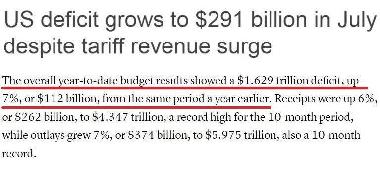 而從本財(cái)年(2024年10月1日至2025年9月30日)的整體情況來(lái)看,在截至7月的前十個(gè)月,美政府累計(jì)財(cái)政赤字已達(dá)1.63萬(wàn)億美元,同比增長(zhǎng)了7%。