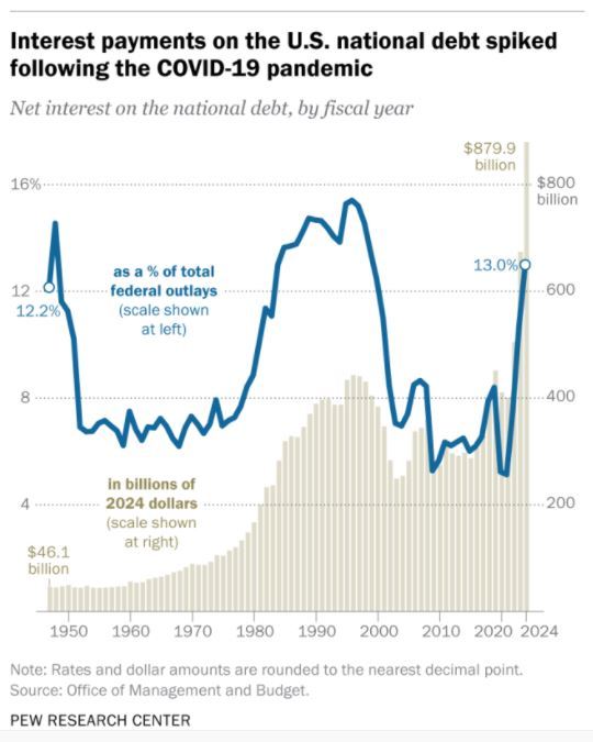 隨著債臺(tái)越筑越高,美國(guó)政府2024財(cái)年支付的凈債息已達(dá)到8799億美元,占當(dāng)年財(cái)政總支出的13%,不僅創(chuàng)下25年來(lái)的最高比例,而且超過(guò)了醫(yī)保支出(8741億美元)和軍費(fèi)支出(8735億美元)。