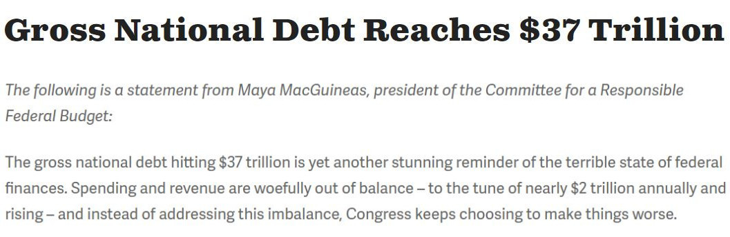 “(美國(guó))國(guó)家債務(wù)總額達(dá)到37萬(wàn)億美元的現(xiàn)實(shí)再次令人震驚地凸顯出聯(lián)邦財(cái)政的糟糕狀況。支出和收入嚴(yán)重失衡每年造成近2萬(wàn)億美元的財(cái)政赤字,然而美國(guó)國(guó)會(huì)不僅沒(méi)有解決這種財(cái)政失衡,反而一直選擇讓事情變得更糟。”