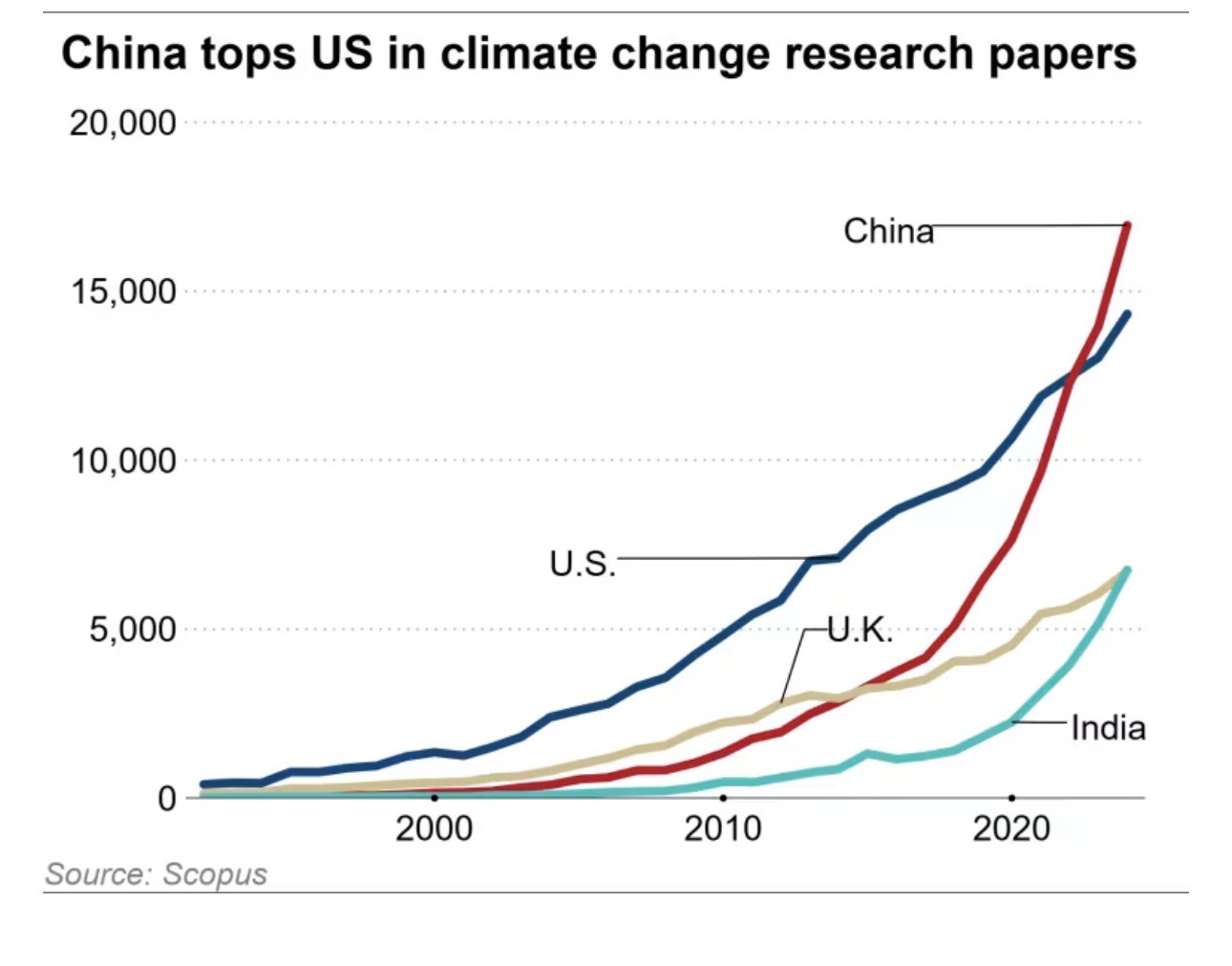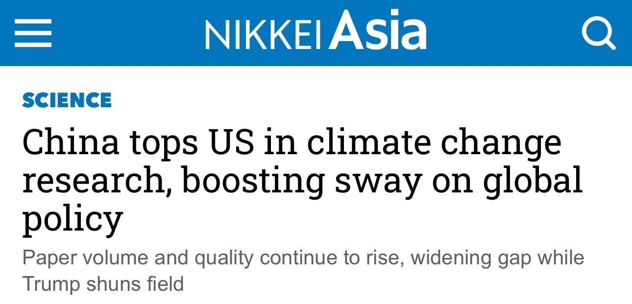 《日經(jīng)亞洲評(píng)論》22日發(fā)布的一篇文章指出,中國在2023年發(fā)表的氣候變化研究論文數(shù)量超過了美國,并在次年擴(kuò)大了領(lǐng)先優(yōu)勢。這一趨勢凸顯了中國全球影響力的持續(xù)增長,與此同時(shí),美國卻在逐漸退出這一領(lǐng)域。