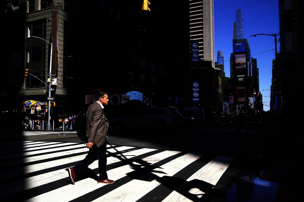10月1日,在美國(guó)紐約曼哈頓的時(shí)報(bào)廣場(chǎng)附近,行人通過人行橫道斑馬線過馬路。新華社記者吳曉凌攝