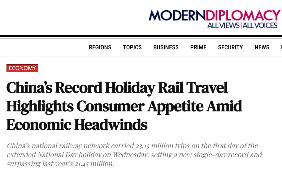 歐洲《現(xiàn)代外交》(Modern Diplomacy)網(wǎng)站報道注意到,中國國慶中秋“超長黃金周”首日,全國鐵路發(fā)送旅客2313萬人次,創(chuàng)下單日歷史新高。報道援引官方預(yù)測稱,整個八天假期出行總量預(yù)計將達(dá)23.6億人次,日均出行近3億人,堪稱“史上最忙假期”。