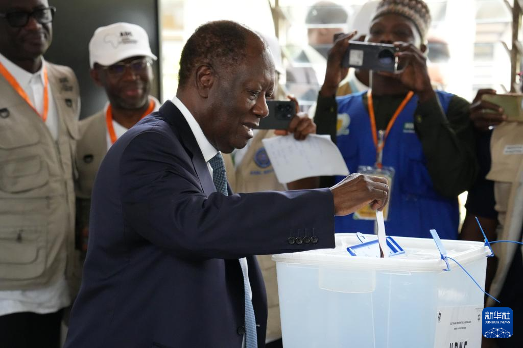 10月25日,在科特迪瓦經(jīng)濟首都阿比讓的一處投票站,科特迪瓦現(xiàn)任總統(tǒng)阿拉薩內(nèi)·瓦塔拉將選票放入投票箱。新華社記者 張健 攝