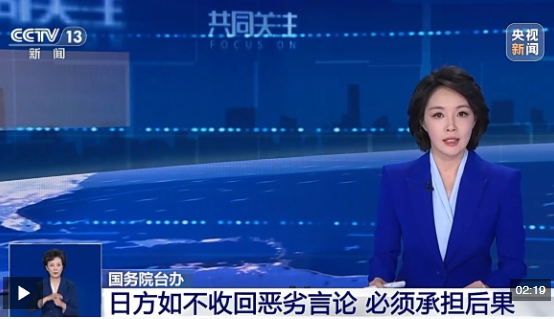 日本在臺(tái)灣問題上對(duì)中國(guó)人民負(fù)有歷史罪責(zé)。甲午戰(zhàn)爭(zhēng)后,日本強(qiáng)行侵占臺(tái)灣并進(jìn)行長(zhǎng)達(dá)半個(gè)世紀(jì)的殖民統(tǒng)治。日據(jù)時(shí)期,臺(tái)灣人民災(zāi)難深重,數(shù)十萬(wàn)同胞被殺害,民眾淪為“亡國(guó)奴”、毫無(wú)政治權(quán)利、信仰自由和文化自由,寶島的礦產(chǎn)資源、民生物資遭瘋狂掠奪。日本侵略者在臺(tái)灣犯下的罪行罄竹難書,是臺(tái)灣歷史最黑暗的一頁(yè)。包括臺(tái)灣同胞在內(nèi)的全體中國(guó)軍民浴血奮戰(zhàn),打敗了日本軍國(guó)主義侵略者,贏得抗日戰(zhàn)爭(zhēng)偉大勝利,光復(fù)臺(tái)灣。在抗戰(zhàn)勝利、臺(tái)灣光復(fù)80周年之際,日方不是反省罪惡歷史、吸取慘痛教訓(xùn),其首相高市早苗反而拋出涉臺(tái)露骨言論且態(tài)度惡劣,妄圖介入臺(tái)海局勢(shì)、否定抗戰(zhàn)勝利成果、挑戰(zhàn)戰(zhàn)后國(guó)際秩序。對(duì)此,中國(guó)政府、中國(guó)人民決不答應(yīng)、決不容忍、決不姑息。日方如不立即糾正錯(cuò)誤,收回惡劣言論,必須承擔(dān)由此引發(fā)的一切后果。如其膽敢武力介入臺(tái)灣問題,我們必將予以迎頭痛擊、堅(jiān)決粉碎。